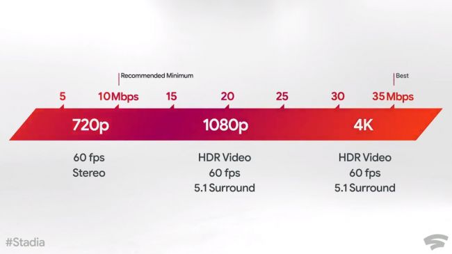 Será necesaria una conexión de por lo menos 10Mb de bajada para utilizar el servicio de forma estable con una resolución de 720p, pero para disfrutar de Google Stadia en todo su esplendor —con gráficos en 4K y sonido 5.1habrá que disponer de 35Mb de bajada.