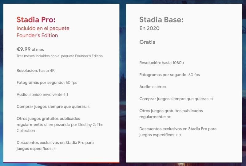 Google ofrece un joystick a 69 dolares o un Stadia Edicion Fundadores a 129 dolares, Chromecast Ultra por 3 meses formato en 4K. Puede jugarse con teclado y mause, celular, talet o algún joystick que sea compatible con la pantalla en que se quiera acceder al contenido de Google Stadia.