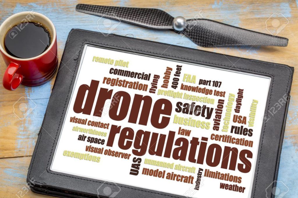 drone regulations (USA, FAA related) word cloud on a digital tablet with a cup of coffee